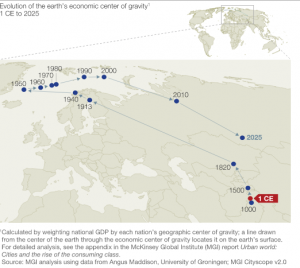 In order to fully appreciate India’s future place on the Internet, one must first appreciate its remarkable past. Many Westerners would be surprised to learn, that but for a veritable blip of history comprising the last few centuries of human progress, India has been at the center of the economic world. As shown on the below map prepared by the McKinsey Global Institute, in the year 1000 AD, the world’s economic center of gravity was in fact, in Asia, just north of current-day India, and west of China.